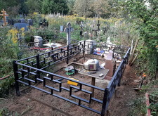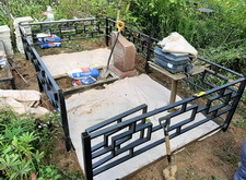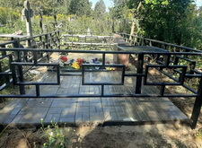 Затем мы приступили к монтажу заранее привезённой на кладбище простой металлической оградки. Параллельно с установкой ограждения мы окончательно очистили участок, а также сварили металлический каркас по периметру могилы. Он не только придаст дополнительную жёсткость ограждению, но и послужит бортами для будущего покрытия.