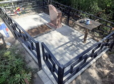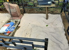 На ткань рассыпаем пескобетонную смесь, после чего закладываем площадь места захоронения бетонной плиткой. Покрытие замываем, затем ждём, пока раствор засохнет и схватится. Все работы по укладке покрытия были проведены при помощи уровня, так что какие-либо неровности или впадины на плитке абсолютно исключены.