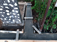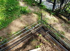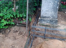 Затем мы приступили к подготовительному этапу установки ограды. Конструкция была объёмной, а потому было необходимо сначала сделать надёжный бетонный каркас. Мы выкопали траншею, а затем там, где это было необходимо, заколотили металлические сваи.