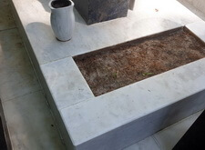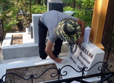 Так выглядело место захоронения на момент окончания работы: деревянный крест покрыт защитным раствором; мраморные изделия отшлифованы и покрыты гидрофобной субстанцией, стыки элементов промазаны белым герметиком; полые столбики, восстановлены; в цветнике заменена земля и посажен газон.