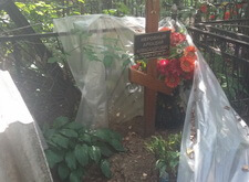 Могила стандартная, не большая. Когда-то здесь стоял гранитный памятник и была высокая ограда. После очередного захоронения плиту убрали в сторону, цветник тоже подняли, переднюю часть ограду демонтировали, установили временный крест.